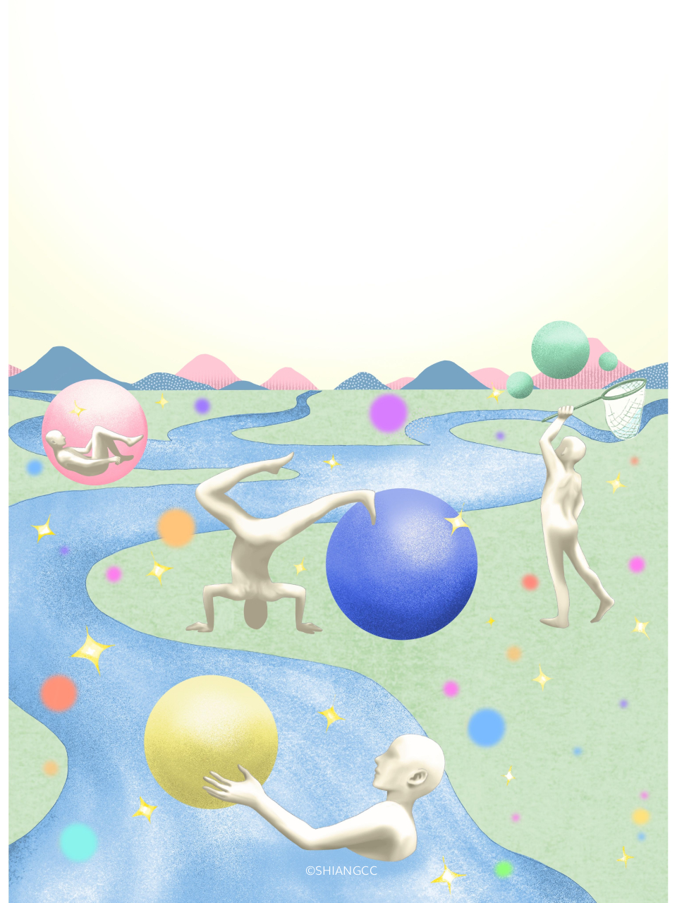 Cover Illustration Digital, 2026. Cover illustration for Wenhsun magazine (文訊雜誌). The flowing river and the interaction between characters and balls represent the author’s thoughts and inspirations, illustrating the theme of the issue, ‘Unfinished Voices.’ Back to Work